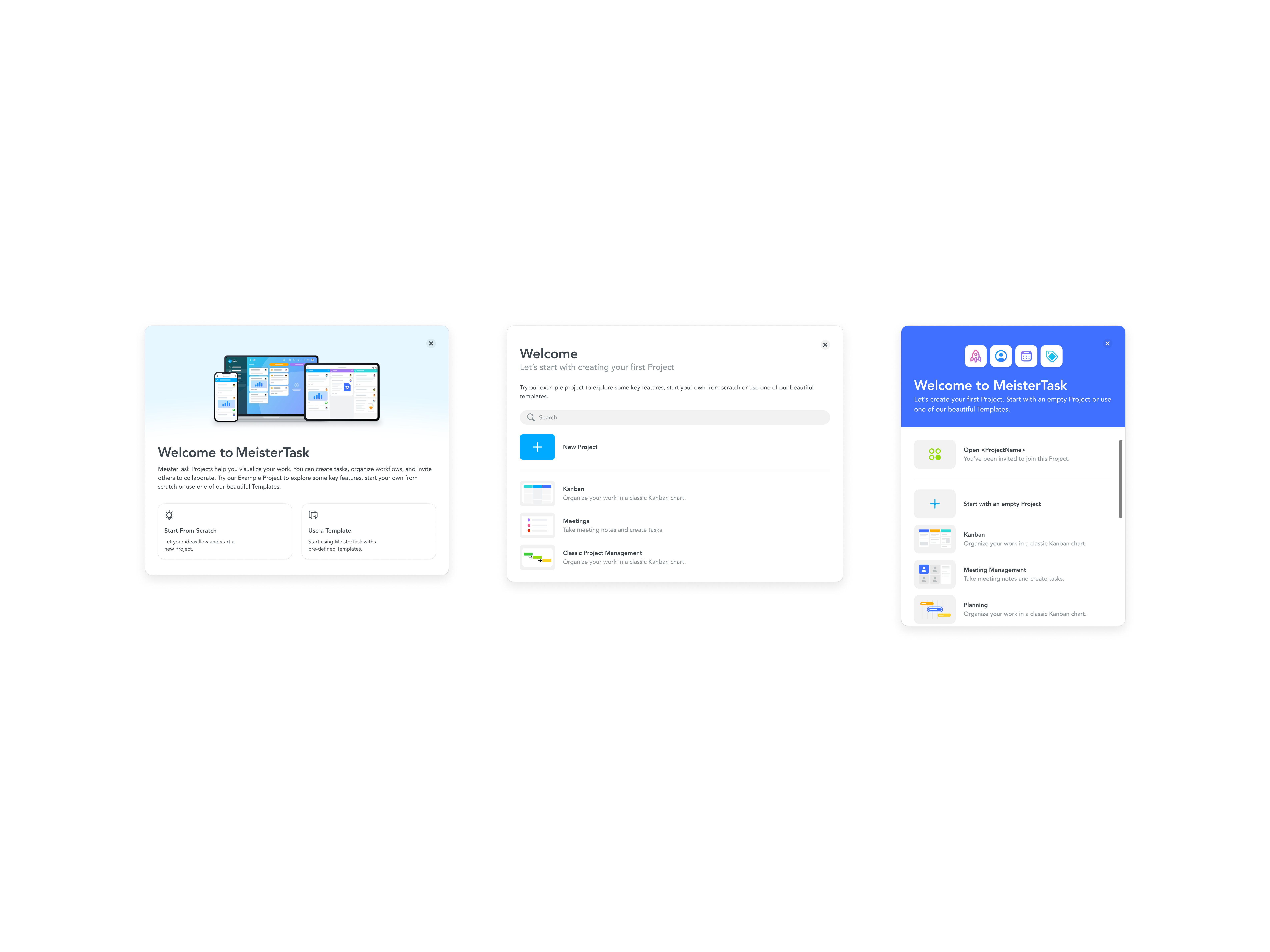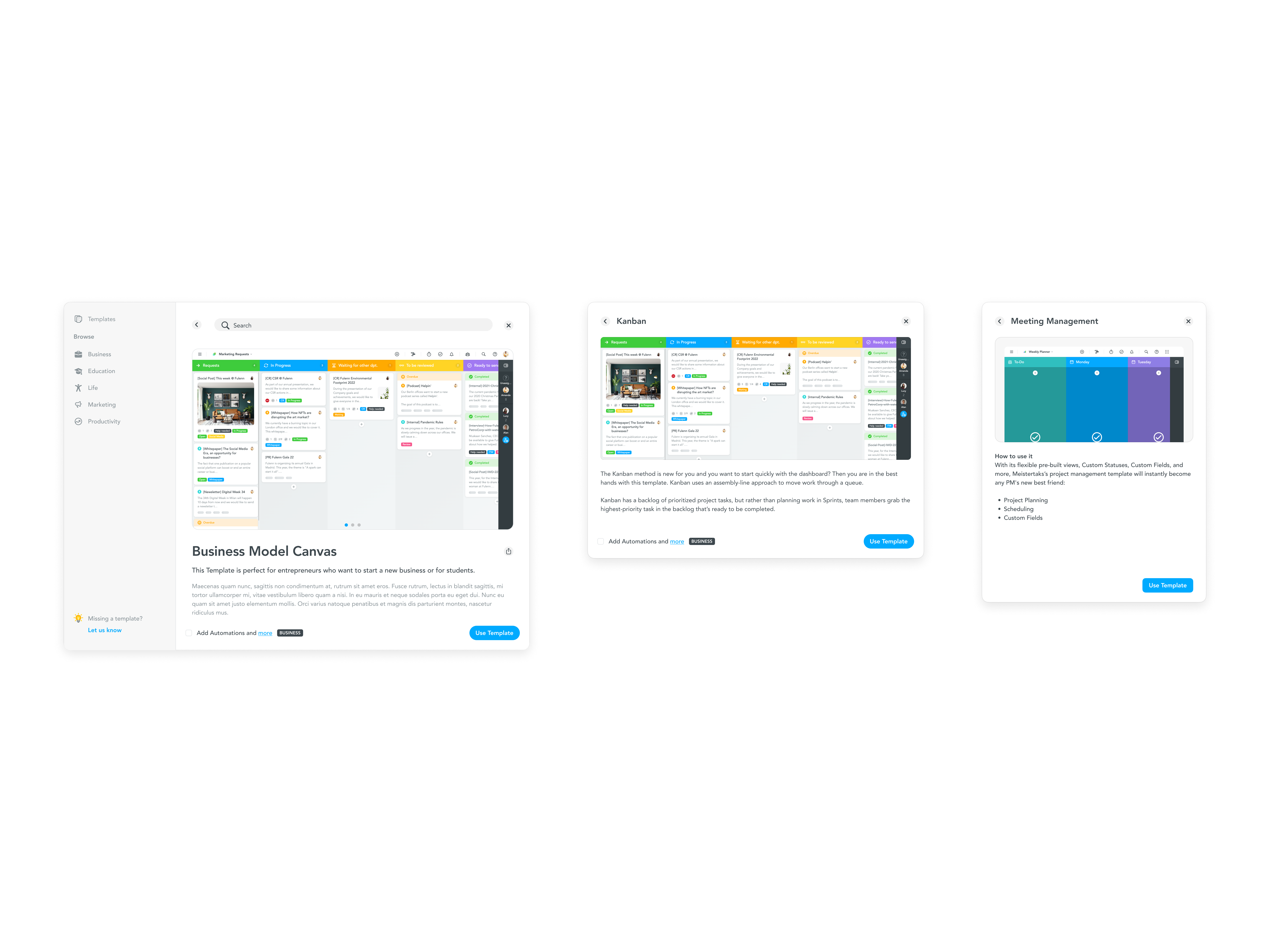 I incorporated known concepts from our current UI; sidebars with icons are used across Meister's products and are familiar to users. The categories presented there are already used in MindMeister. The "shop" idea was explored, where users can browse all available templates. Some are personalized based on the user's profile (e.g., Business user or belonging to a specific industry). This dynamic approach based on the user's profile aimed to provide inspiration, usability, and up-to-date offerings.