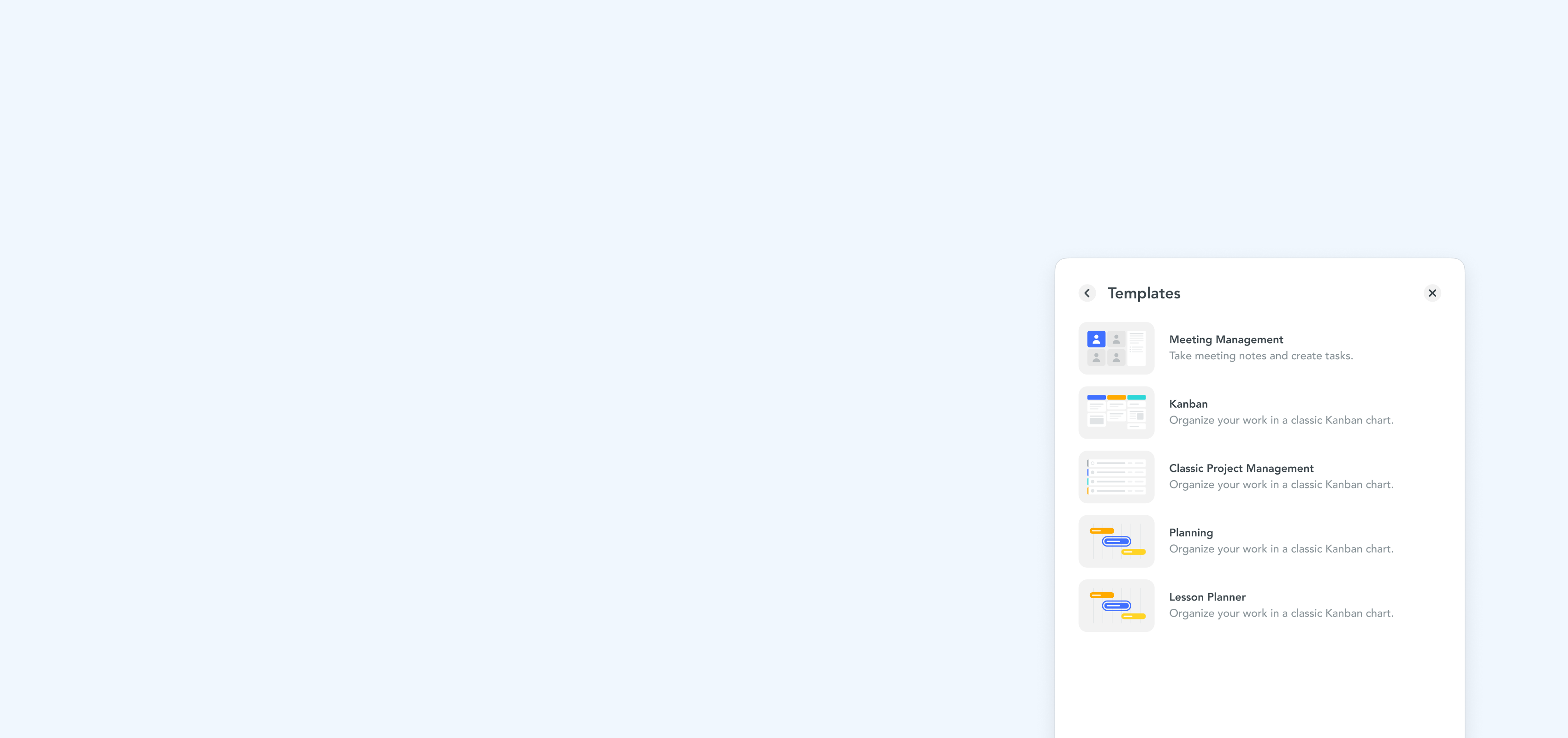 The content of the template view was also a key discussion point. We didn't have the final content marketing would provide for this view. From the design side, we agreed on having the minimum content – a title, a short description, and a screenshot. Additionally, templates would have an illustration and an icon.