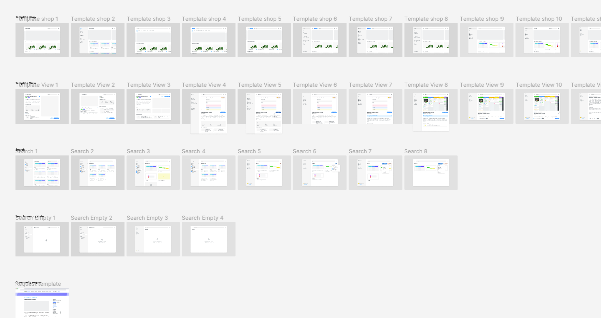 Considering the insights shared during the Research phase and using our design language, I let my ideas flow freely and created 45 screens. Some areas had numerous variations, such as the Template shop, where users would browse available templates, the Template view, and the Search results. I aimed to determine the most effective layout to make templates noticeable, easily understandable, and usable. Here are some explorations I did.